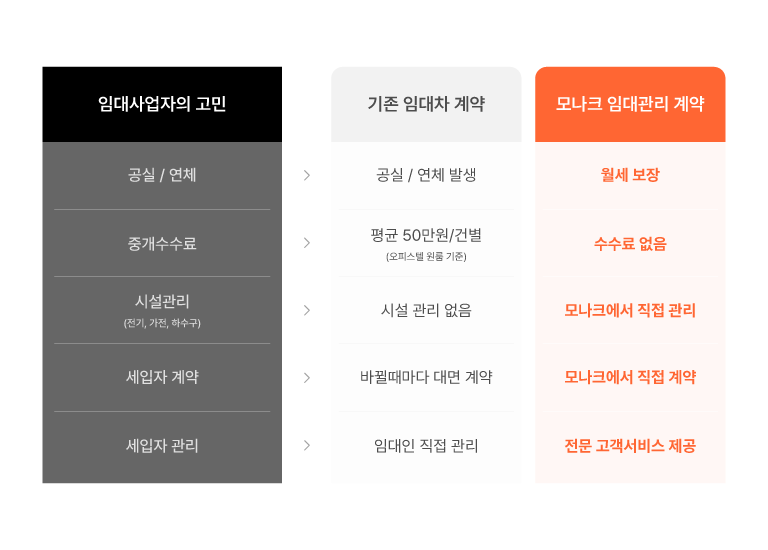 매년 바뀌는 세입자와 번거롭게 부동산 계약을 할 필요가 없으며, 악덕 세입자로 인해 고통 받을 일도 없습니다. 모나크의 자체적인 필터링 시스템을 통해서 세입자 관리가 되고 안전하고 깨끗하게 공간을 사용할 수 있도록 해드립니다.